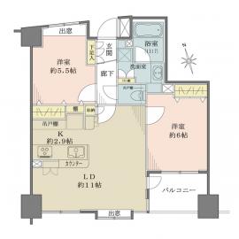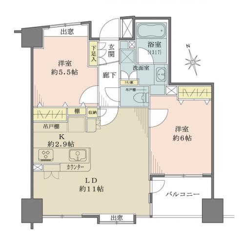 間取り 2LDK 専有面積 55.95m2(16.9坪) 壁芯
