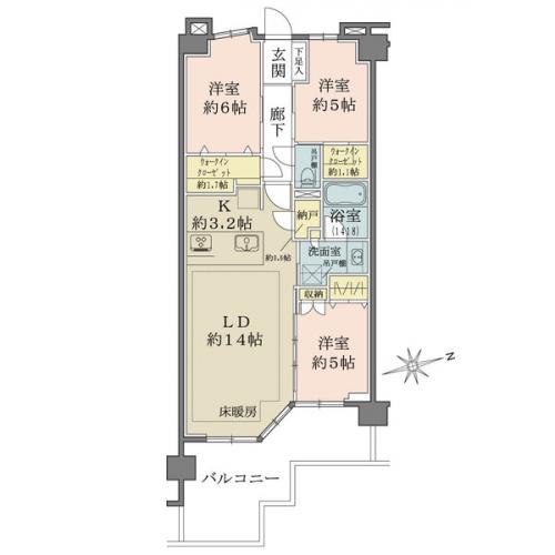 間取り 3LDK 専有面積 75.14m2(22.7坪) 壁芯