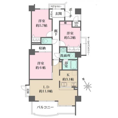 間取り 3LDK 専有面積 73.21m2(22.1坪) 壁芯