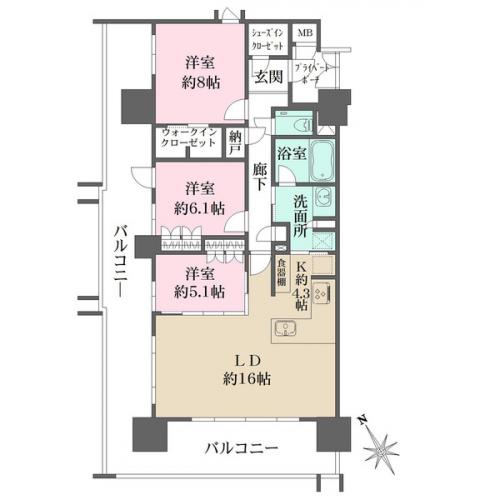 間取り 3LDK 専有面積 93.08m2(28.1坪) 壁芯