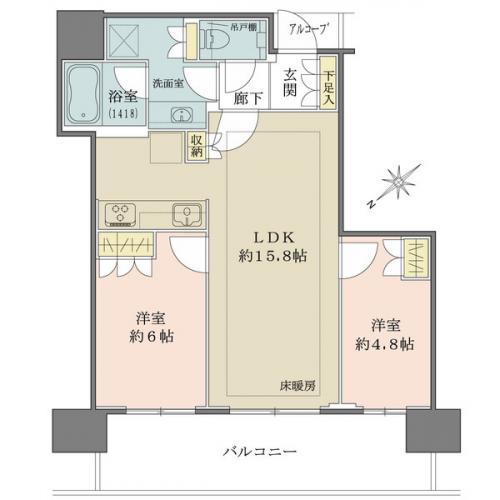 間取り 2LDK 専有面積 59.74m2(18.0坪) 壁芯