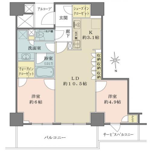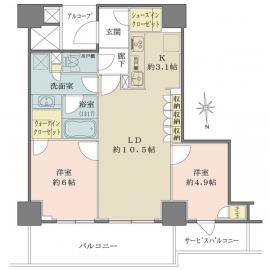 間取り 2LDK 専有面積 58.23m2(17.6坪) 壁芯
