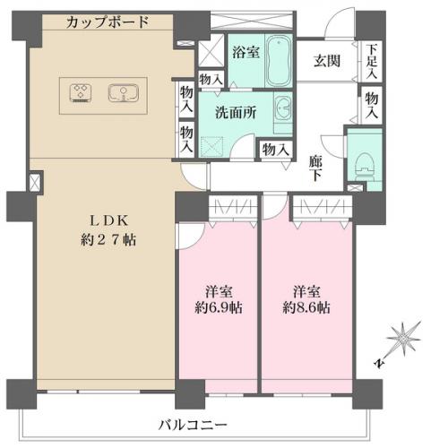 間取り 2LDK 専有面積 102.23m2(30.9坪) 壁芯