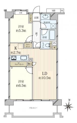 間取り 2LDK 専有面積 55.00m2(16.6坪) 壁芯