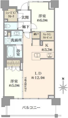 間取り 2LDK 専有面積 64.25m2(19.4坪) 壁芯