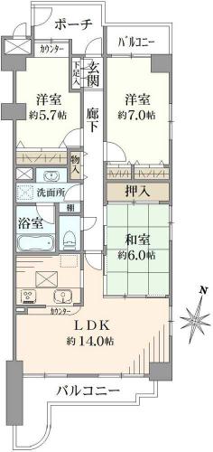 間取り 3LDK 専有面積 77.59m2(23.4坪) 壁芯
