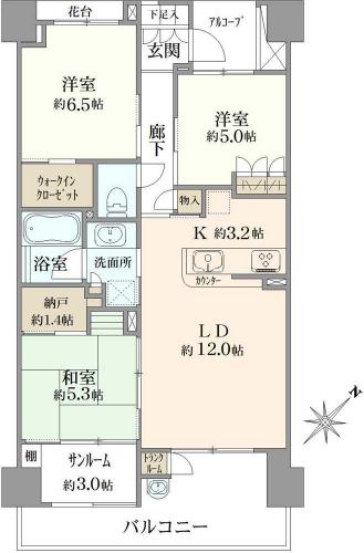 間取り 3LDK 専有面積 76.93m2(23.2坪) 壁芯