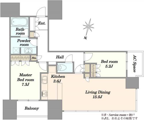 間取り 2LDK 専有面積 76.72m2(23.2坪) 壁芯