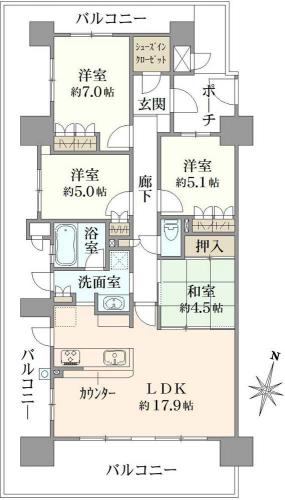 間取り 4LDK 専有面積 90.75m2(27.4坪) 壁芯
