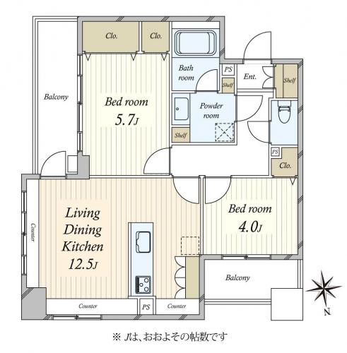 間取り 2LDK 専有面積 55.41m2(16.7坪) 壁芯