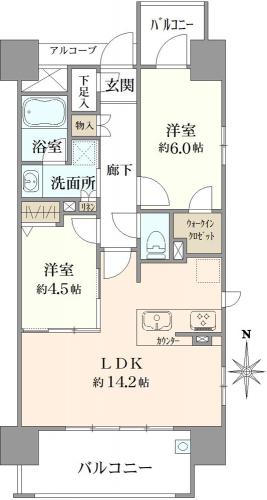 間取り 2LDK 専有面積 58.14m2(17.5坪) 壁芯