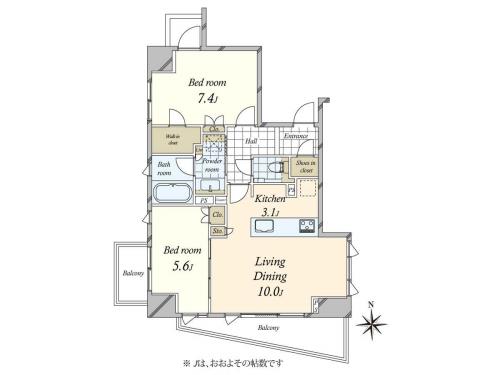 間取り 2LDK 専有面積 60.43m2(18.2坪) 壁芯