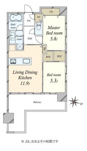 間取り 2LDK 専有面積 57.03m2(17.2坪) 壁芯
