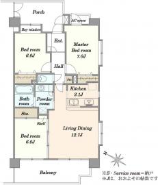 間取り 3LDK 専有面積 75.52m2(22.8坪) 壁芯