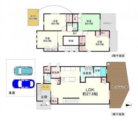 備考 ・2階洋室の最高天井高さ約4.0m ・2階洋室約6.0帖にはロフトがあります。・シャッター付き駐車スペース(2台分) ≪設備≫ ・エネファーム・エコキュート・太陽光発電システム ・ 床暖房(キッチン、リビング、ダイニング) ・ キッチン:食洗機・浄水器専用水栓 ・ 浴室:酸素美泡湯・浴室乾燥機・ミストサウナ・眺望が見渡せる窓 ・ トイレ(1階):タンクレス(アラウーノ) ・ 洗面化粧台(1階):ツインボウル