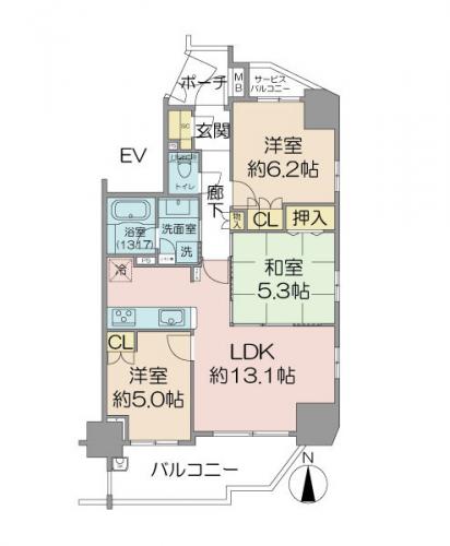 間取り 3LDK 専有面積 64.57m2(19.5坪) 壁芯