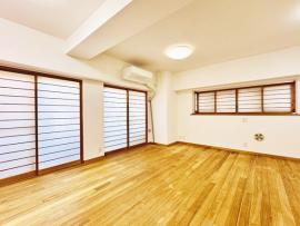 • 明るいフローリングの洋室。大きな窓と障子風の引き戸があり、和モダンな雰囲気