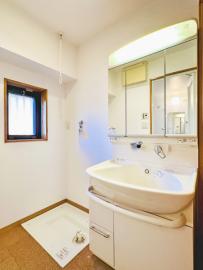 • 三面鏡付きの洗面化粧台で収納力あり。洗濯機置き場も隣接し、窓付きで換気良好。
