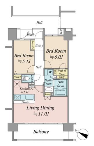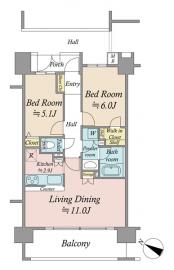 間取り 2LDK 専有面積 56.26m2(17.0坪) 壁芯