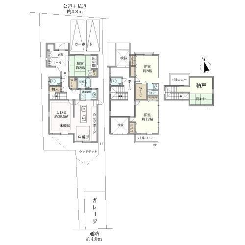 土地面積 278.22m2(84.1坪) 実測 別途私道負担約2.3m2 (セットバック要) 建物延面積 212.49m2