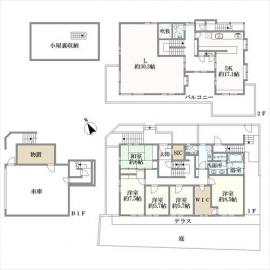 備考 WIC=ウォークインクローゼット、SIC=シューズインクローゼット、家具等は販売価格に含まれません。延床面積に車庫・物置面積59.58㎡含む(登記簿謄本に基づく記載)、建物構造:鉄筋コンクリート・木造スレート葺