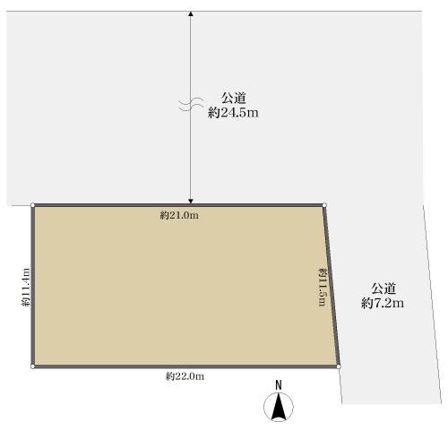 二方 北約24.5m公道、間口:約21.0m 東約7.2m公道、間口:約11.5m |