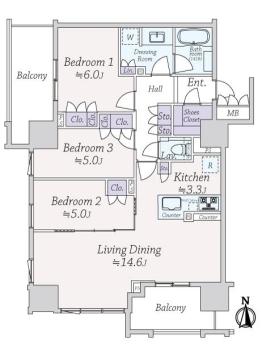 間取り 3LDK 専有面積 76.75m2(23.2坪) 壁芯