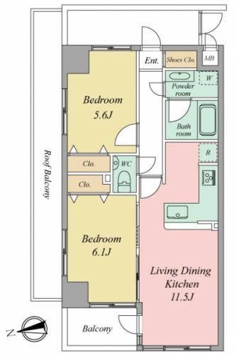 間取り 2LDK 専有面積 51.25m2(15.5坪) 壁芯