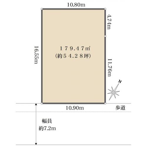• 南東側道路接道。前面道路幅員約7.2m、間口約10.9m。
