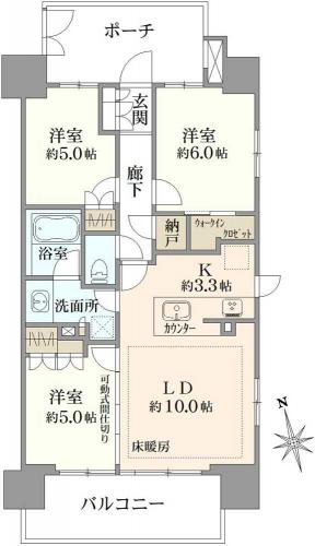 間取り 3LDK 専有面積 65.10m2(19.6坪) 壁芯