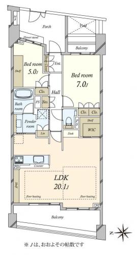 間取り 2LDK 専有面積 74.61m2(22.5坪) 壁芯