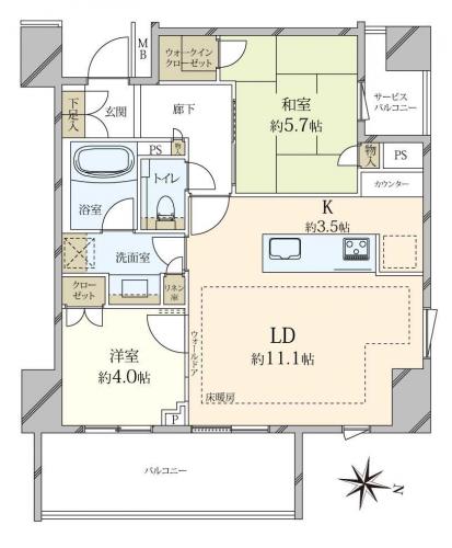 間取り 2LDK 専有面積 55.73m2(16.8坪) 壁芯