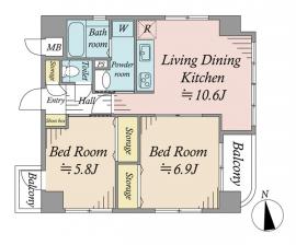 間取り 2LDK 専有面積 53.35m2(16.1坪) 壁芯