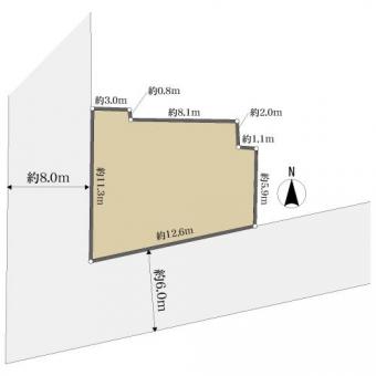 | 接道状況 | 角地 西8.0m公道、間口:11.3m 南6.0m公道、間口:12.6m | ||