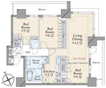 | 間取り | 3LDK | 専有面積 | 73.56m2(22.2坪) 壁芯 |