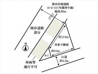 | 接道状況 | 二方 南東約4.5m公道、間口:約9.0m 北西約30.0m公道、間口:約12.0m | ||