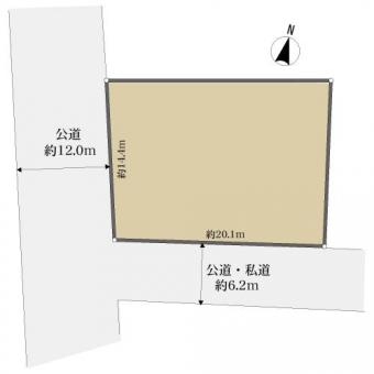 | 接道状況 | 二方 西約12.0m公道、間口:約14.4m 南約6.2m私道、間口:約20.1m(位置指定道路) | ||