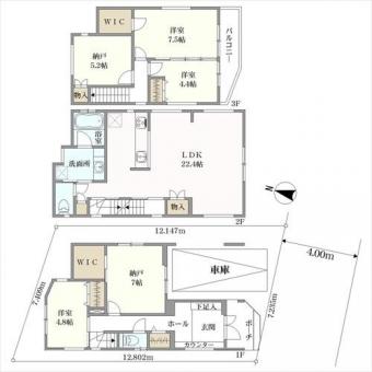 | 土地面積 | 88.04m2(26.6坪) 登記簿 | 建物延面積 | 143.30m2 車庫部分13.82m2含む |