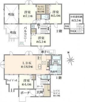 | 土地面積 | 128.10m2(38.7坪) 別途私道負担22.25m2 | 建物延面積 | 102.44m2 |
