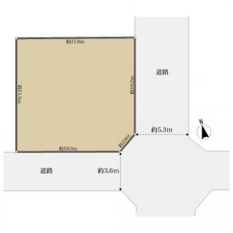 | 接道状況 | 角地 東約5.3m公道、間口:約10.2m(位置指定道路) 南約3.6m公道、間口:約10.3m(位置指定道路) | ||