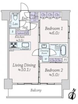 | 間取り | 2LDK | 専有面積 | 55.27m2(16.7坪) 壁芯 |