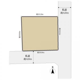 | 接道状況 | 二方 東約4.0m私道、間口:約10.5m(位置指定道路) 南約4.0m私道、間口:約10.9m(位置指定道路) | ||
