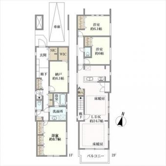 | 土地面積 | 123.46m2(37.3坪) 登記簿 | 建物延面積 | 145.03m2 車庫部分15.94m2含む |