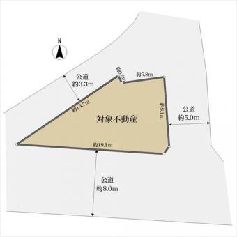 | 接道状況 | 三方 北西約3.3m公道、間口:約14.7m 北東約5.0m公道、間口:約9.1m 南約8.0m公道、間口:約19.1m | ||