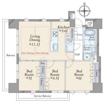 | 備考 | 2面に面する、西向きワイドバルコニー ●サービスバルコニー面積/約4.44m2(約1.34坪)南向き:使用料無償 ●自転車置場(1住戸1台)/空無:使用料無償※2025年9月25日現在 ●バイク置場/空無(月額)2,000円/台※2025年9月25日現在 ●ペットの飼育については別途ペット飼育細則を遵守していただきます ●管理方式/日勤【週5日】月曜・水曜・木曜・金曜・土曜/8:00~12:00 ●リビングダイニングに床暖房設置 |
