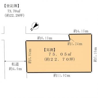 | 土地面積 | 75.05m2(22.7坪) 実測 別途私道負担11.00m2 | ||