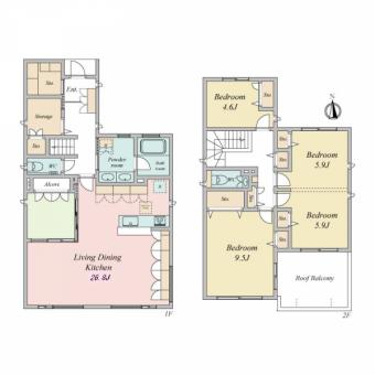 | 土地面積 | 159.11m2(48.1坪) 登記簿 別途私道負担36.86m2 | 建物延面積 | 137.08m2 |