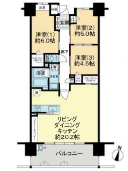 | 間取り | 3LDK | 専有面積 | 75.64m2(22.8坪) 壁芯 |