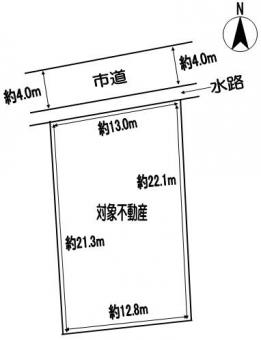| 備考 | 敷地と道路の間に水路が存しており、水路(水路橋)を介して接道しています。建物解体渡し。建築条件無し。仮測量面積:280.50平米(差異が生じる可能性有)。建物建築等の際は、水路橋の設置替えおよび占用許可取得が必要です。 |