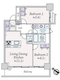 | 間取り | 2LDK | 専有面積 | 56.21m2(17.0坪) 壁芯 |